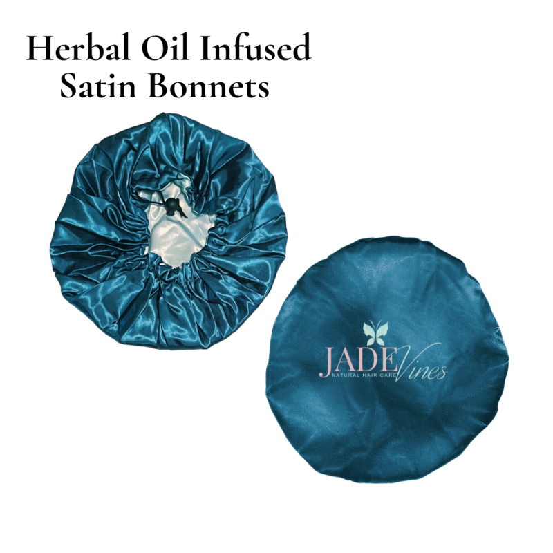 The Jade Vines Herbal Satin Bonnet is infused with a calming blend of botanical ingredients that promote scalp wellness, hair retention, and a sense of peace of mind.